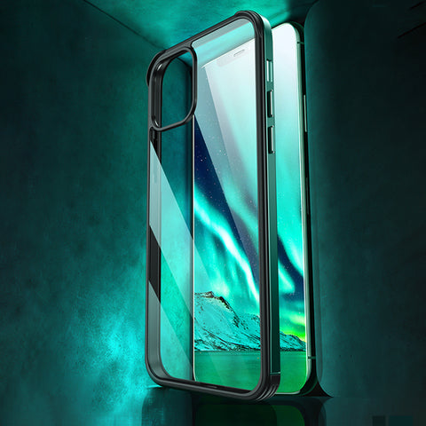 "Elegant stötsäkert iPhone 12-fodral med metallram, transparent design, skydd mot fall och stötar, hållbar och stilren"