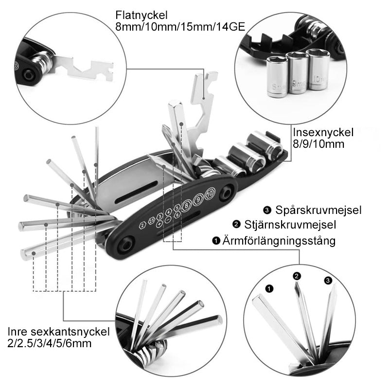 - Funktioner: Skiftnycklar, insexnycklar, skruvmejslar m.m.
