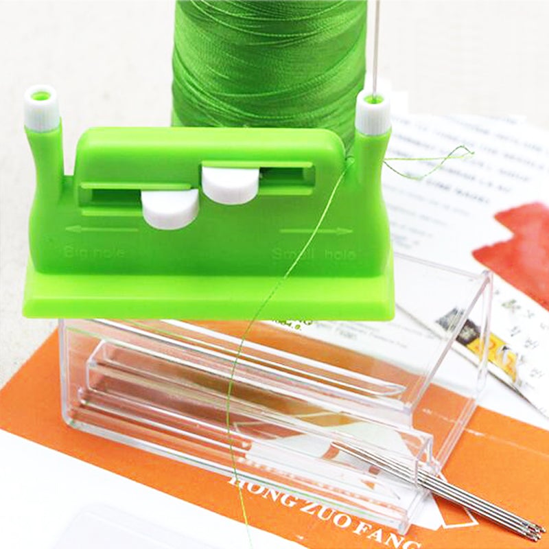 "Dubbelsidig nålträdare i plast och stål med dubbelhålsdesign för effektiv nålträdning, inkl. genomskinlig förvaringslåda."