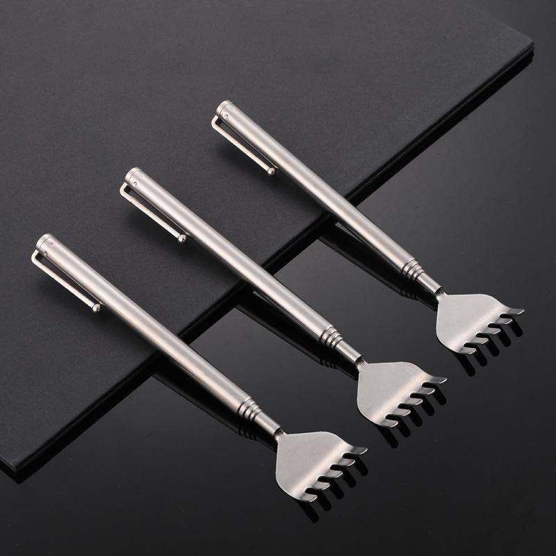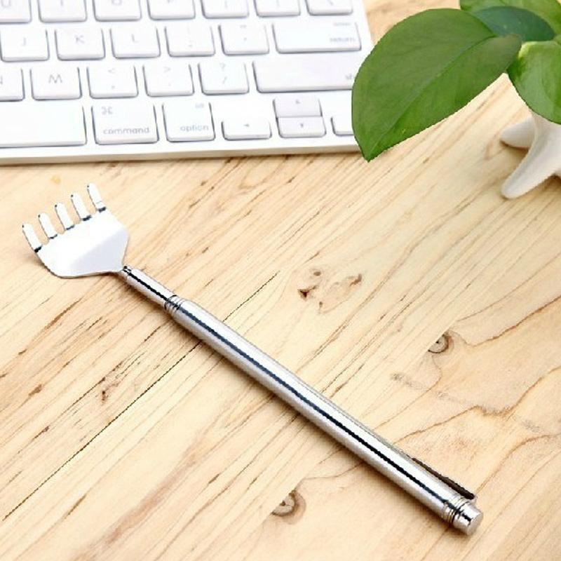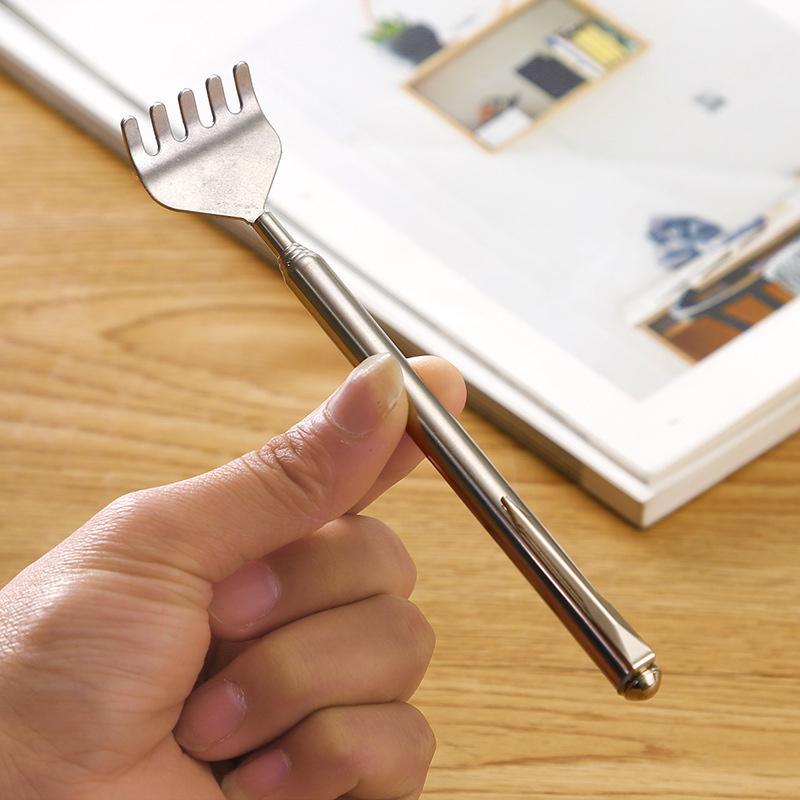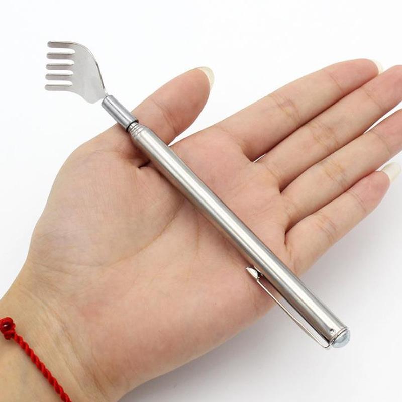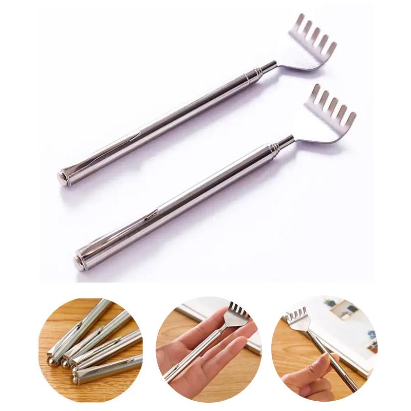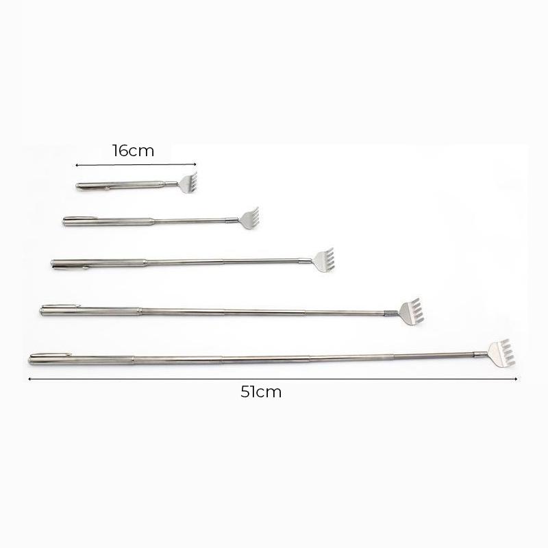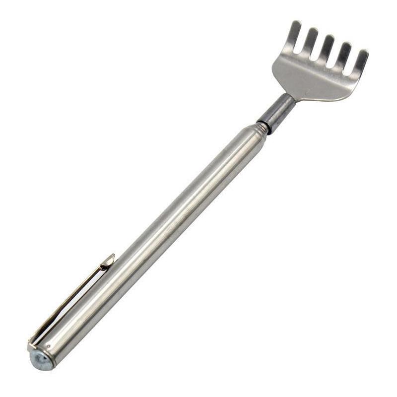 "Flexibel ryggskrapa i rostfritt stål, teleskopisk design med bekvämt handtag för självständig ryggklining."