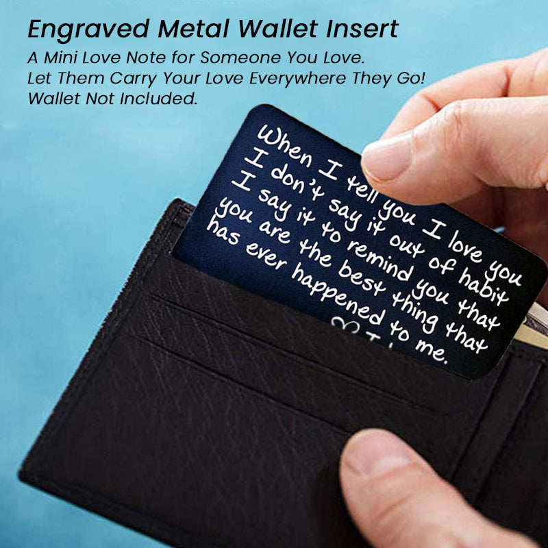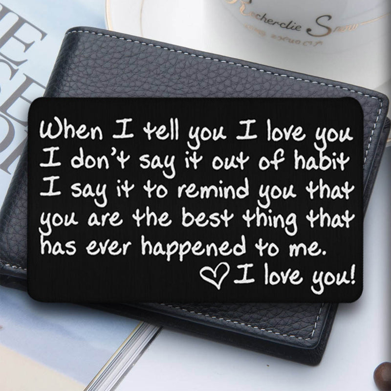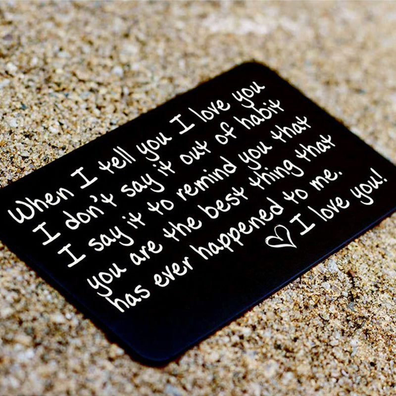 Överraska din älskade med en personlig och kärleksfull gåva som kommer att hålla för evigt. Vårt unika plånbokskort i rostfritt stål kombinerar känsla och hållbarhet, vilket gör det till den perfekta gåvan för varje speciell anledning. Med en graverad kärleksnotis kommer detta kort att ge ett leende på mottagarens läppar varje dag.