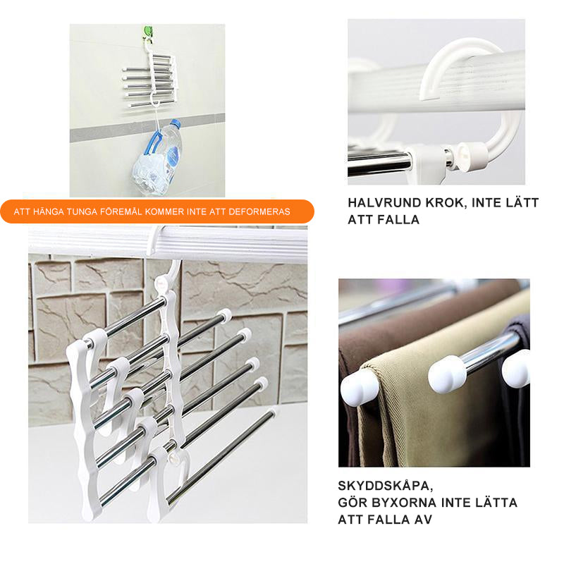 Oavsett om du letar efter en lösning för att få ordning på byxor, bälten eller andra klädtillbehör, kommer vårt multifunktionella hängare att göra din dagliga rutin mycket enklare och din garderob mycket mer funktionell.