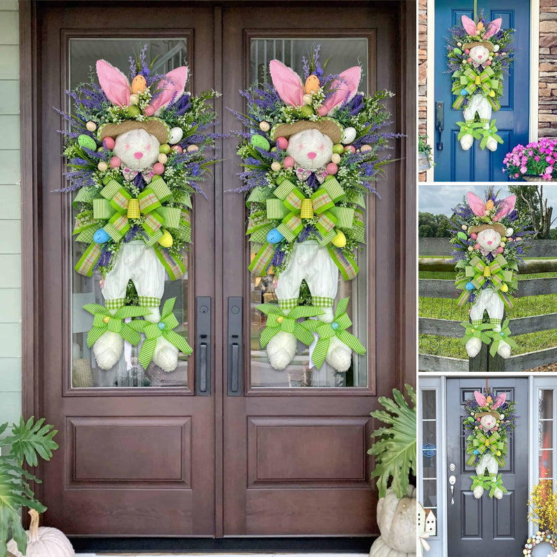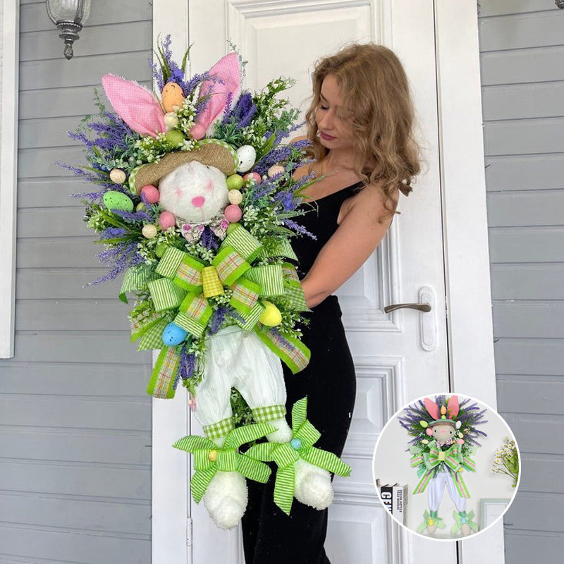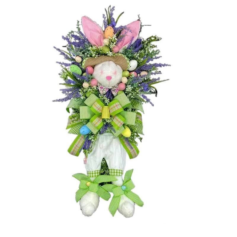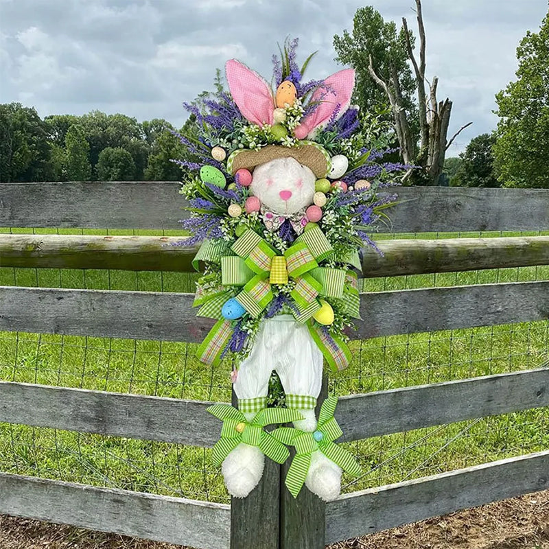 "Charmig påskhare krans i färgglad plast, lämplig för dörrar och trädgårdar. Påskdekoration för inomhus och utomhus."