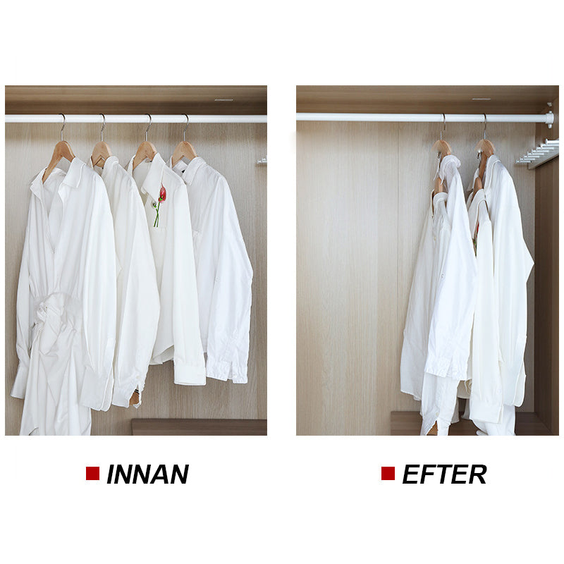 • Spara utrymme: Häng kläder vertikalt för att maximera garderobsutrymme.