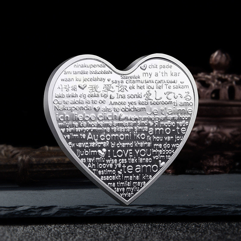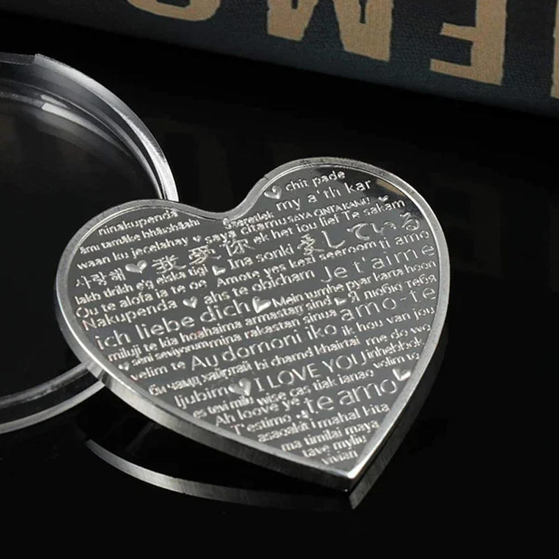 • Romantisk Symbol: Hjärtformat mynt utsmyckat med kärleksbudskap på 52 olika språk för att symbolisera global kärlek.