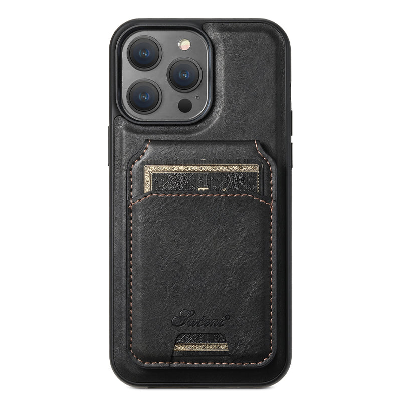 "Elegant smartphonefodral i svart PU-läder med integrerad korthållare och magnetiskt stativ för praktiskt användande."