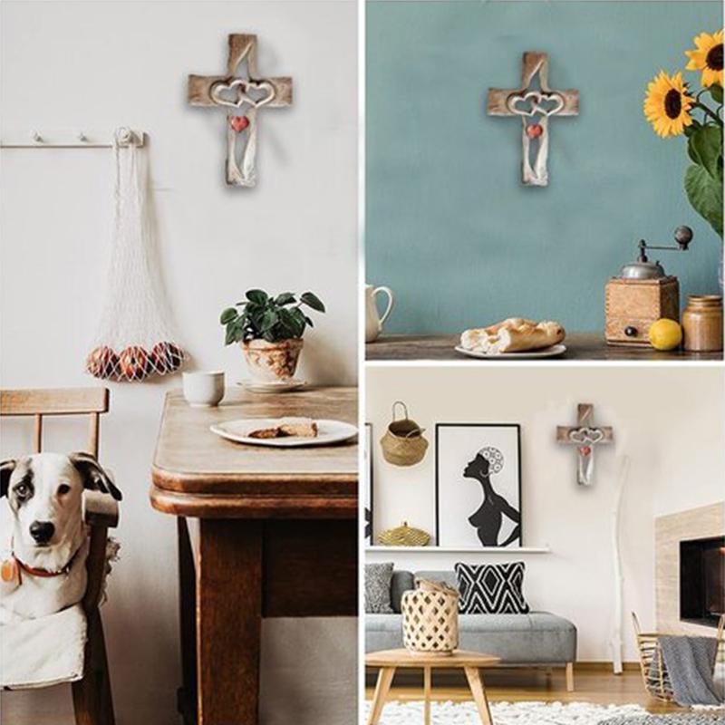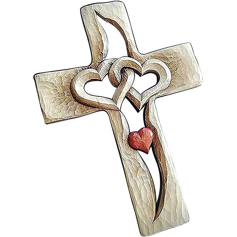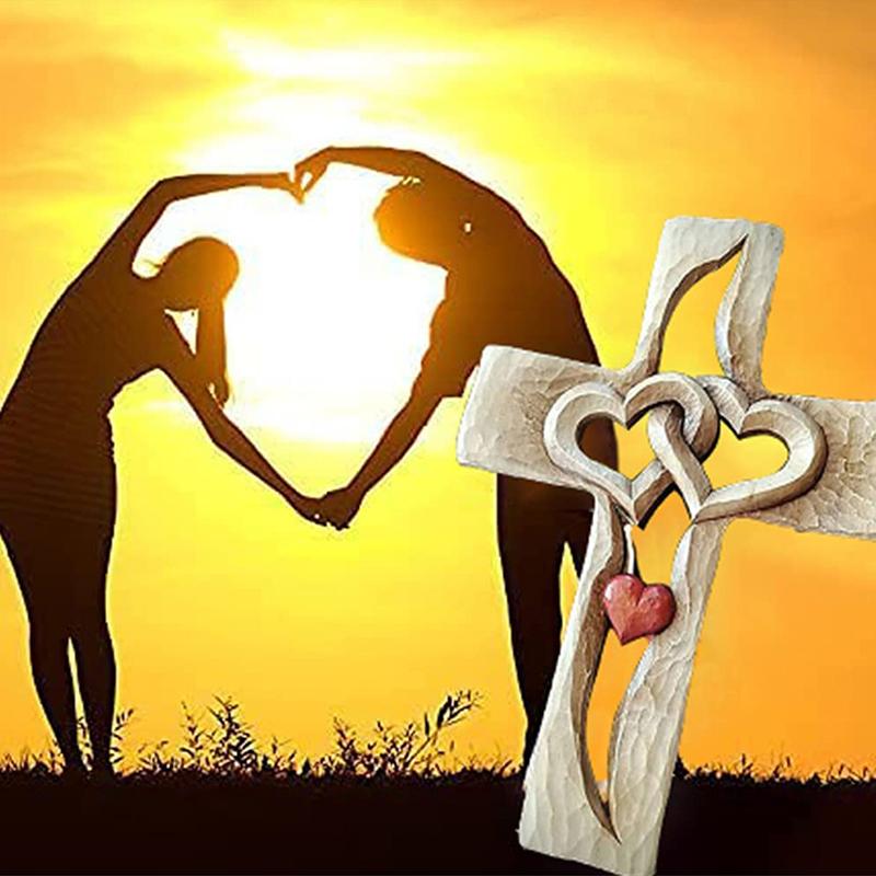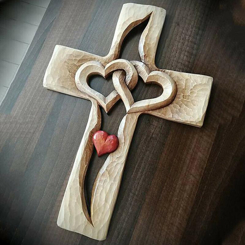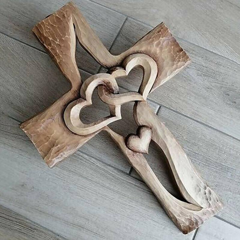 Detta snidade träkors av furuträ är mer än bara en dekoration – det är en symbol för evig kärlek, med omsorgsfullt inskurna hjärtan som aldrig skiljer sig åt. Ett uttryck för skönhet och tro som kan placeras var som helst i hemmet.